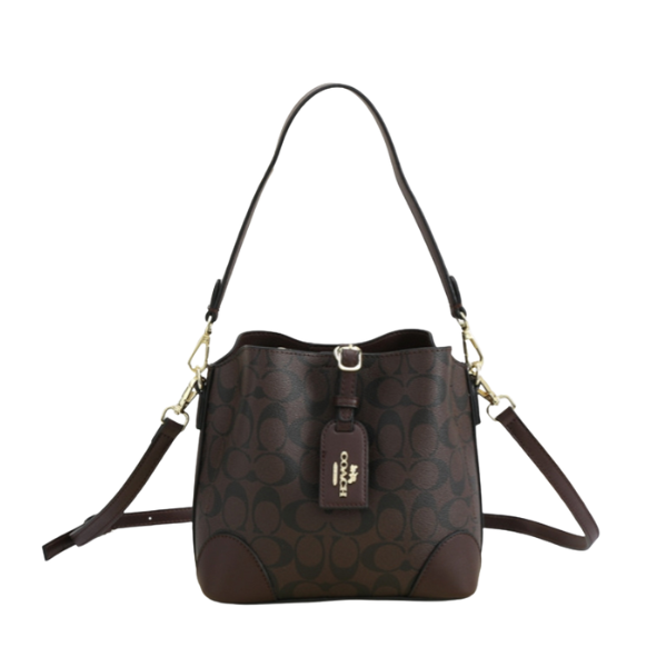 This is a Coach Signature Top Handle Bucket Bag, featuring the iconic Coach monogram pattern in a brown and tan color scheme. The bag has a bucket-style silhouette with a drawstring closure at the top, and it also includes a detachable leather strap and a top handle, offering versatility in carrying options. The bag is made from Coach’s signature textile jacquard, which is a blend of 30% recycled polyester and 70% regenerative cotton. The leather accents are responsibly sourced, with Coach aiming to use 90% gold and silver-rated tannery leather by 2025. Coach is known for its high-quality leather goods and is considered a luxury brand.